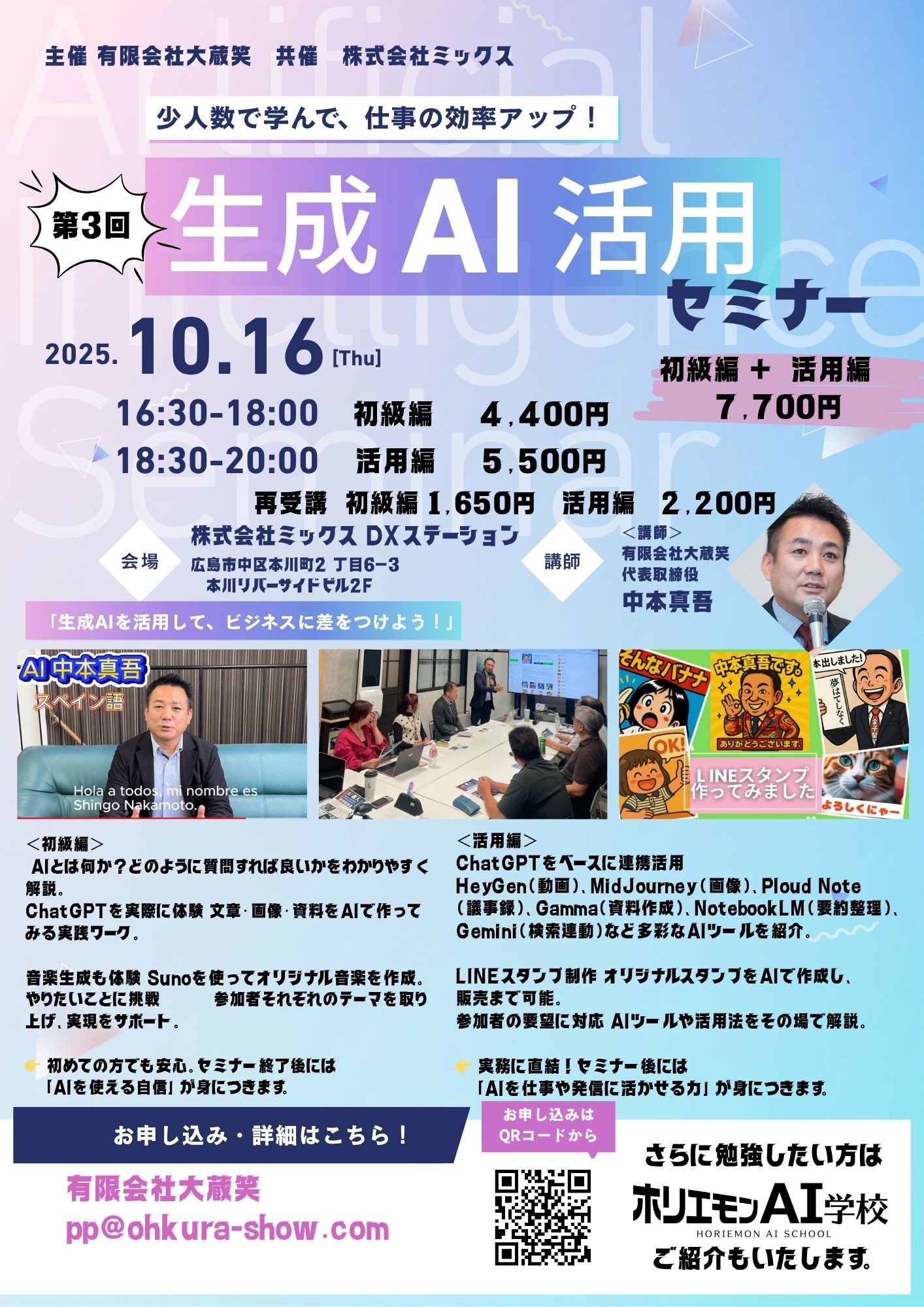 お申し込み・詳細はチラシ記載のQRコード、または下記メールまでご連絡ください。