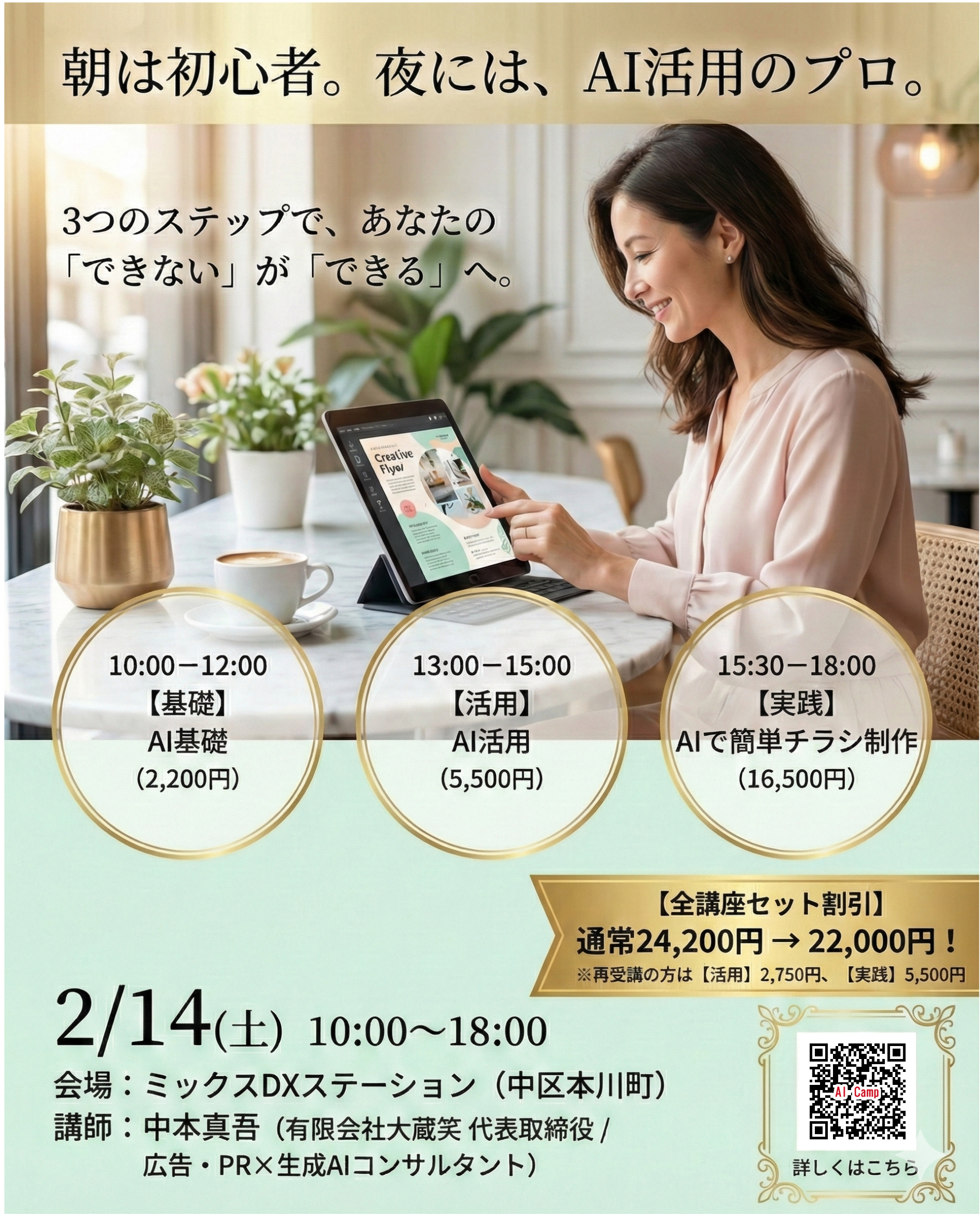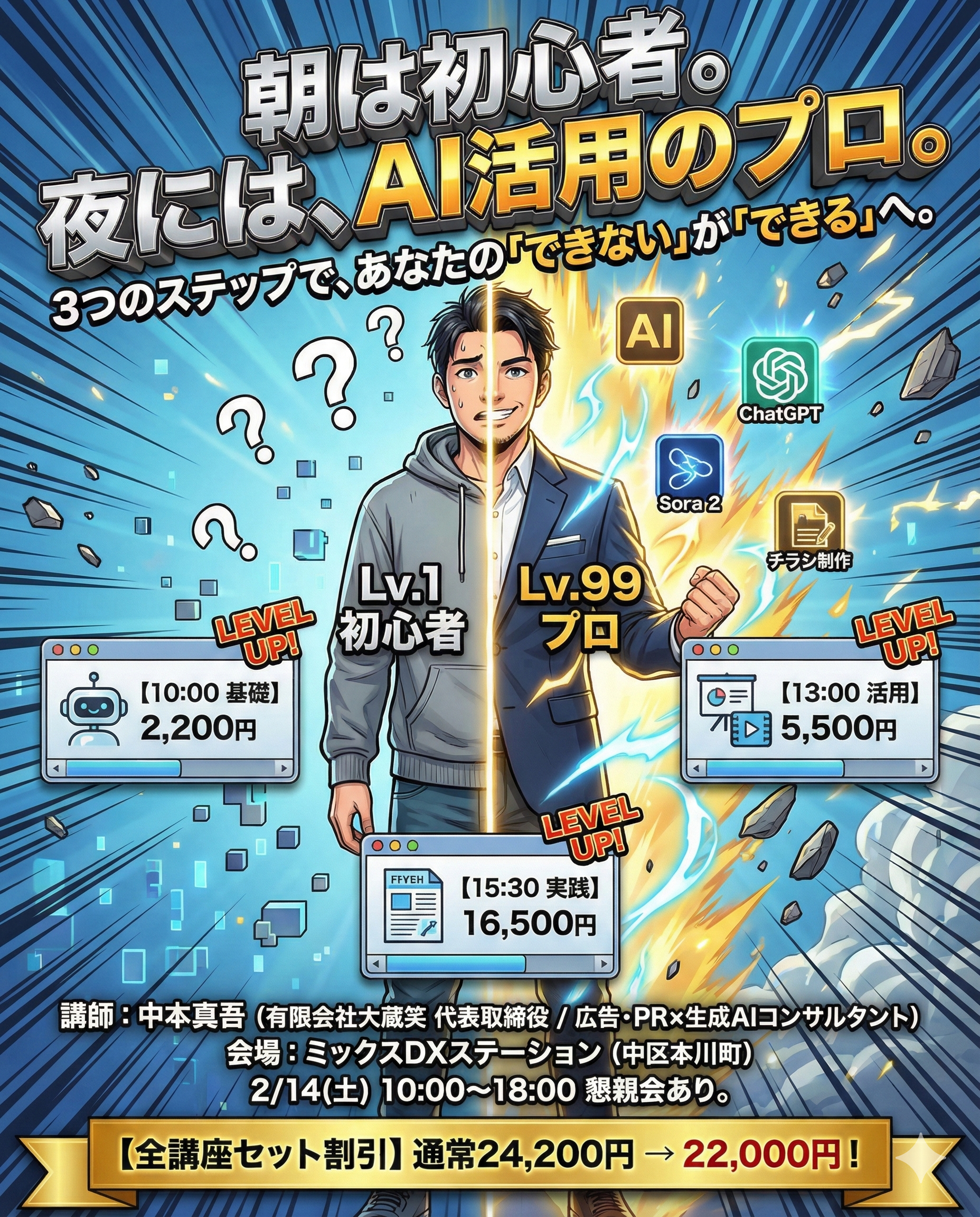| 実践編 | 15:30〜18:00 | チラシ量産(坂田誠プロンプト)・動画制作 | 16,500円 | 5,500円 |
